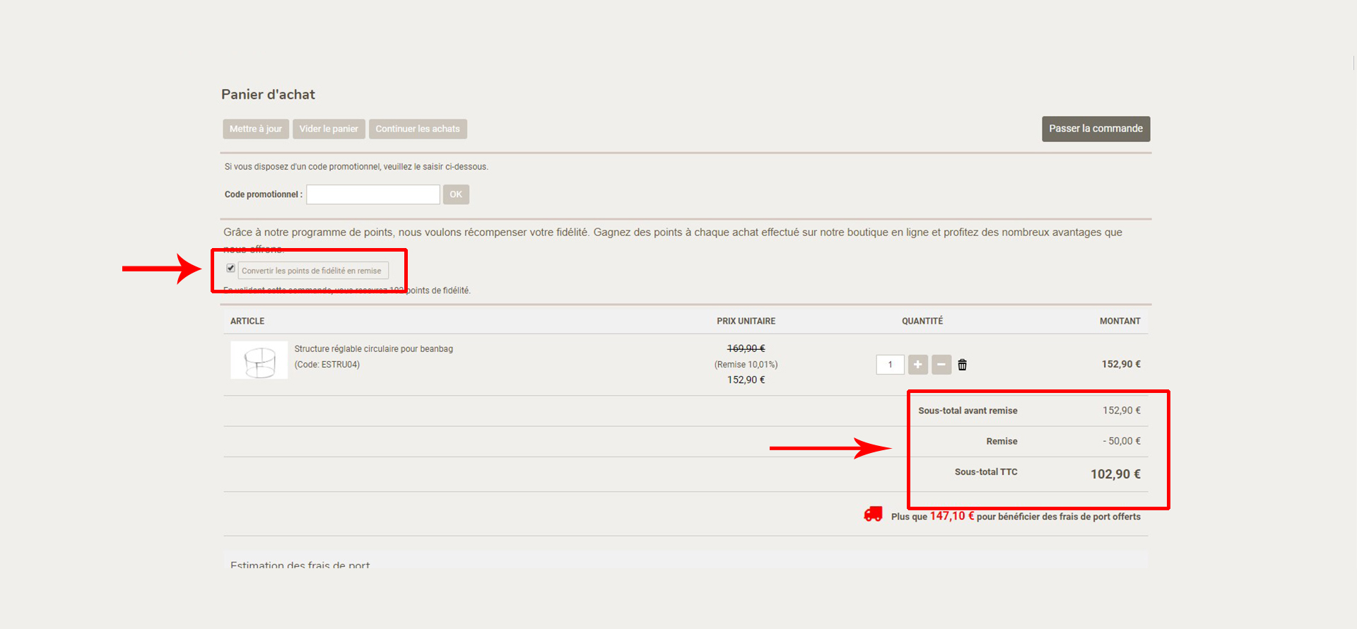 Vous pouvez commencer à économiser maintenant! Pour terminer le processus, lorsque vous avez tous les articles dans le panier, vous pouvez voir en haut une case que vous devez cocher pour appliquer la remise de points de fidélité sur cet achat. Si vous cochez cette case, la remise sera appliquée directement sur le total de votre commande. ![]() | |||